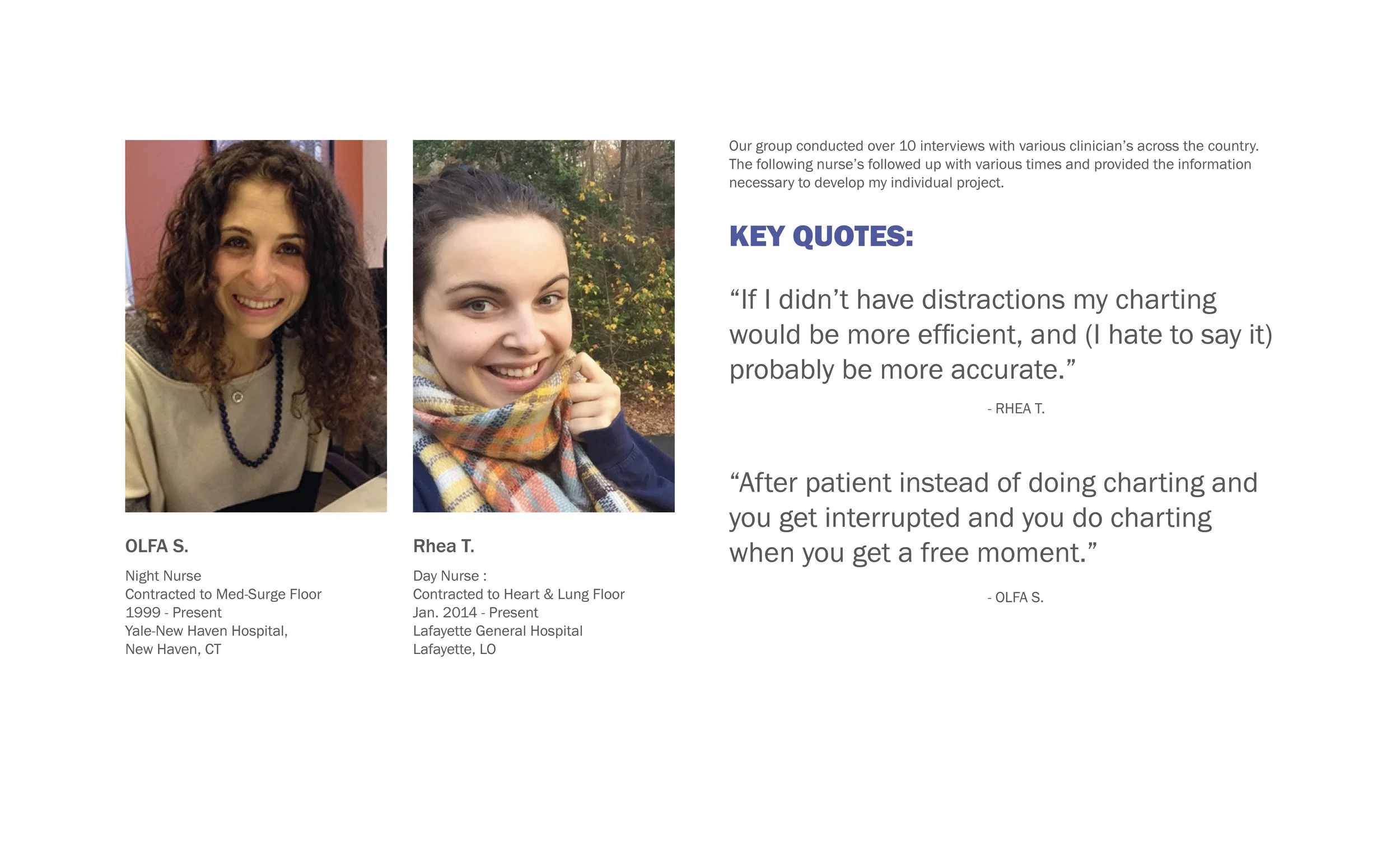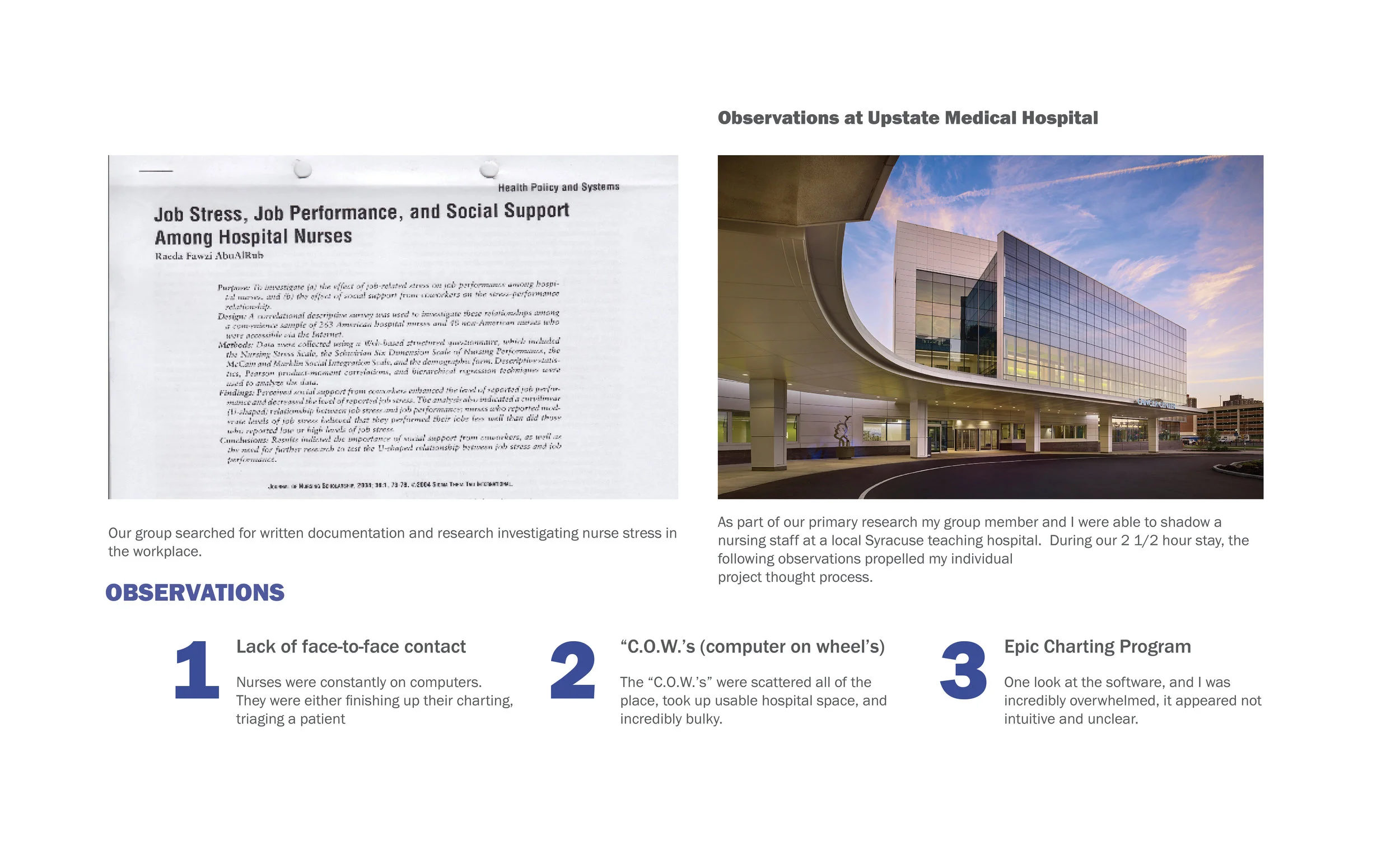 Our group conducted Primary and Secondary research with staff at Upstate Medical Center in Syracuse, New York addition to interviews with Nurses from across the East Coast.